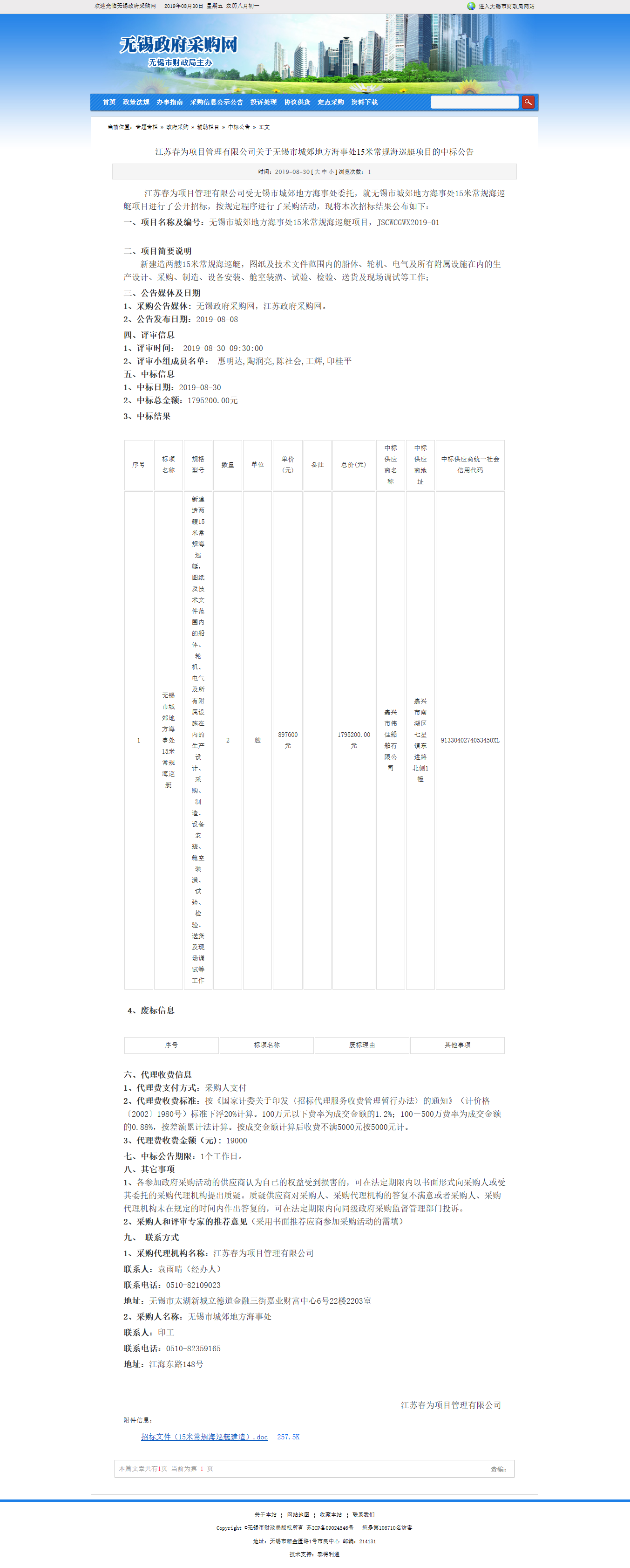 中標(biāo)公告(無錫市城郊地方海事處15米常規(guī)海巡艇項(xiàng)目)